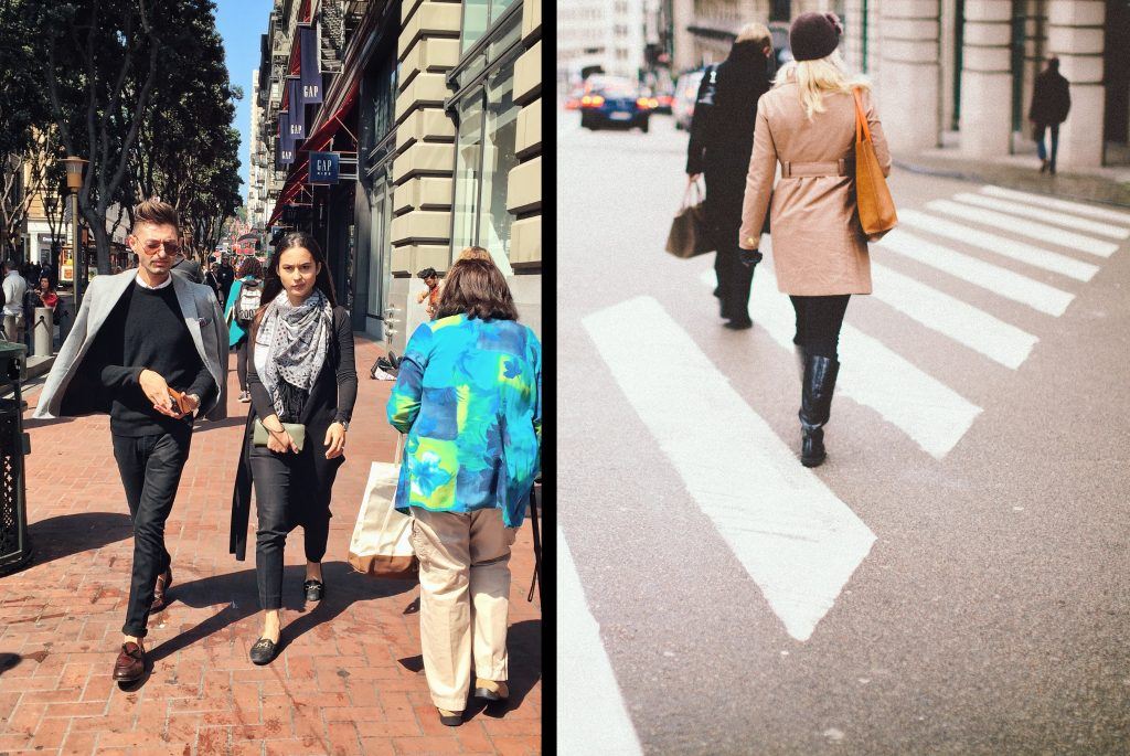 The photograph on the left does capture an interesting candid point of view. It depicts two young fashion-oriented millennial adults walking past a much older woman, who has a very different sense of fashion.