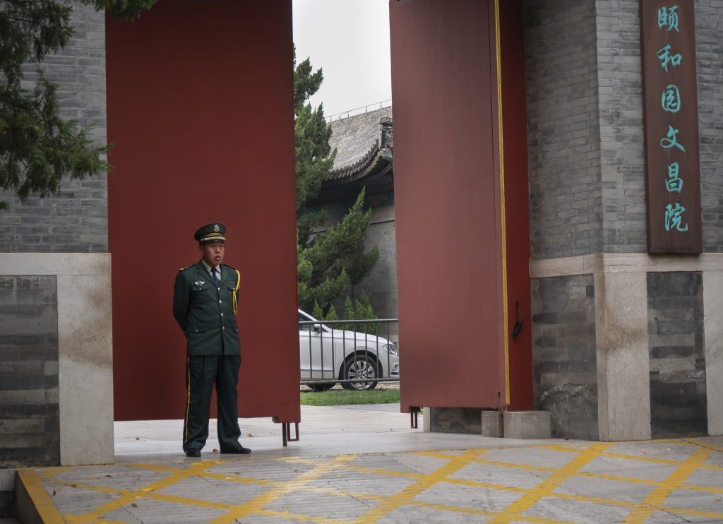 The action here is that the man is standing guard. He is not physically moving at all. There is an implied action. If I had tried to run through that door, then his implied action would become immediately apparent!