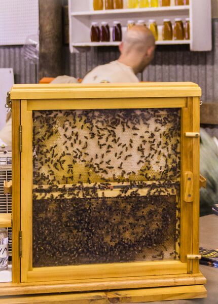 This photo is of a beekeeper’s booth at the Warren County Farmer’s Fair. Camera: Canon Rebel T2i, Lens/Focal Length: Canon 28–135 mm @ 28 mm, Aperture: f/3.5, Shutter Speed: 1/60 sec, ISO: 1600. Photo by Andrew Darlow