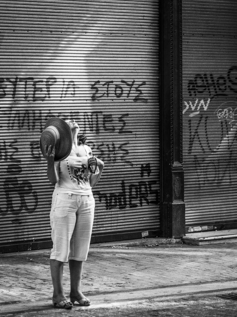 Composition has played a key role in adding an emotional context to this powerful street photograph. Every element in the photograph forces the viewer’s eyes toward the woman. Despite the fact that we can’t see her face, we know something is wrong, and we can feel her discomfort.