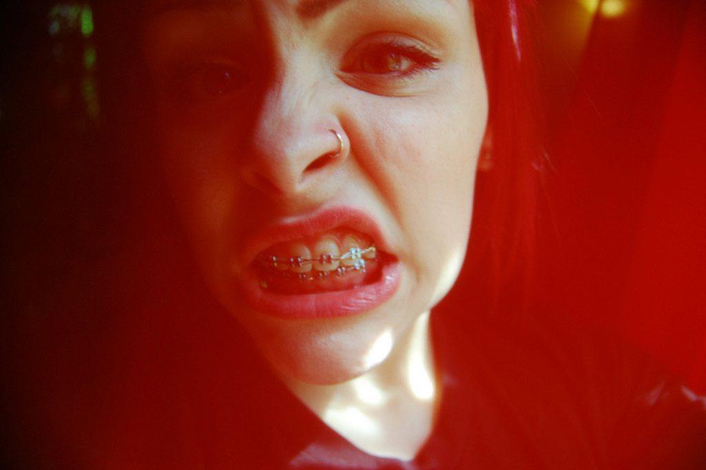 This photographer placed a red sheer curtain between her subject and the camera. The red curtain created an out of focus color wash that definitely “amped up” the emotional context of the subject and her expression.