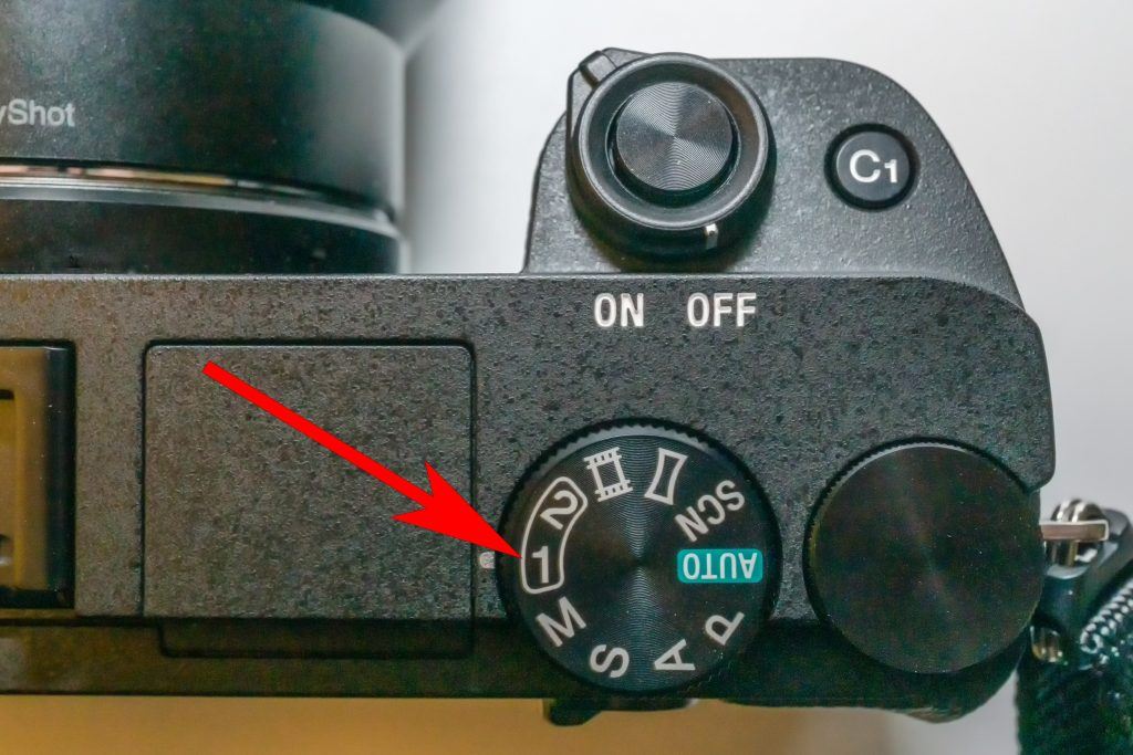 The red arrow points toward the “User Programmable Preset no. 1” on my Sony A6300. This is my “people” default setting. No. 2 is for full manual control, so I don’t have to think too much about resetting when shooting “tabletop photographs” or other manual setting types of photographs. Photo by Charles Haacker