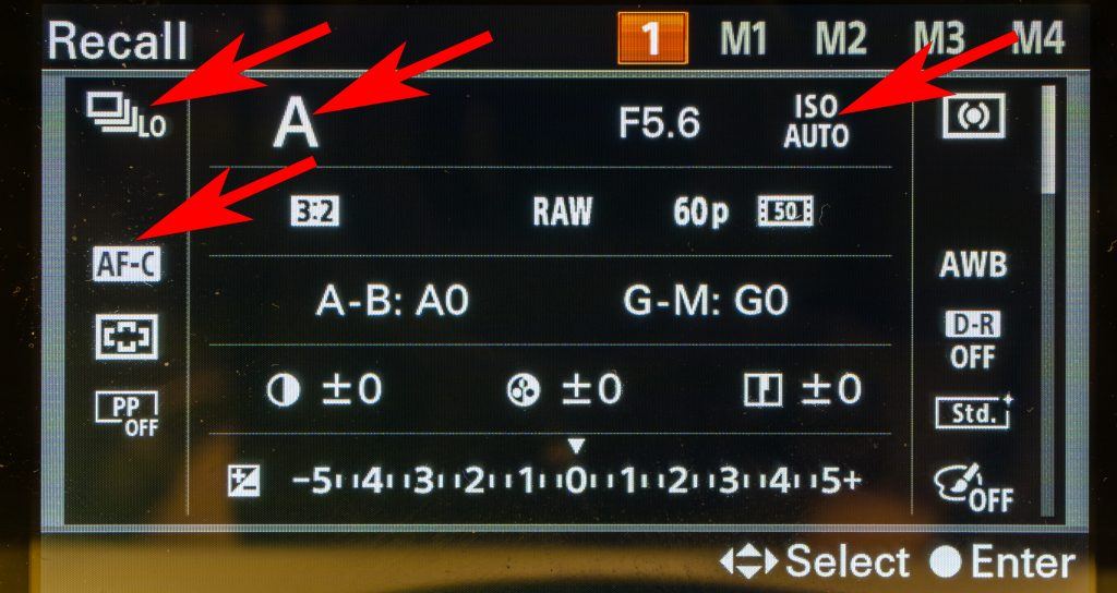 Depending on your camera and its abilities, many have programmable settings, often right on the dial and often numbered. I use an unmatched pair of mirrorless ILCs (Interchangeable Lens Cameras), both Sonys – the A6000, and a newer A6300. Both my Sony cameras have the Memory Recall (MR) detents on the dial, the user-programmable memory settings, plus several other handy programmable buttons. Together they help keep me from repeating the mistakes I have described above.