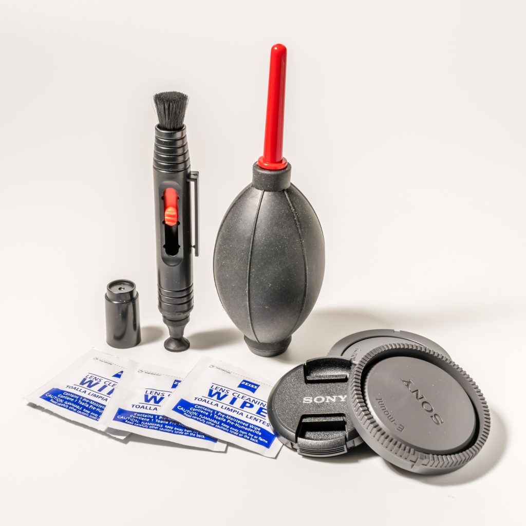 A basic and essential cleaning kit. Bulb blower (the only kind recommended by manufacturers), retractable brush with a microfiber tip that can be safely used to dislodge stuff that won’t blow off, and (in my case) some alcohol wipes for the lenses, not the sensor. Body caps and lens caps help keep the dirt out in the first place, but they are not dustproof. Photo by Charles Haacker
