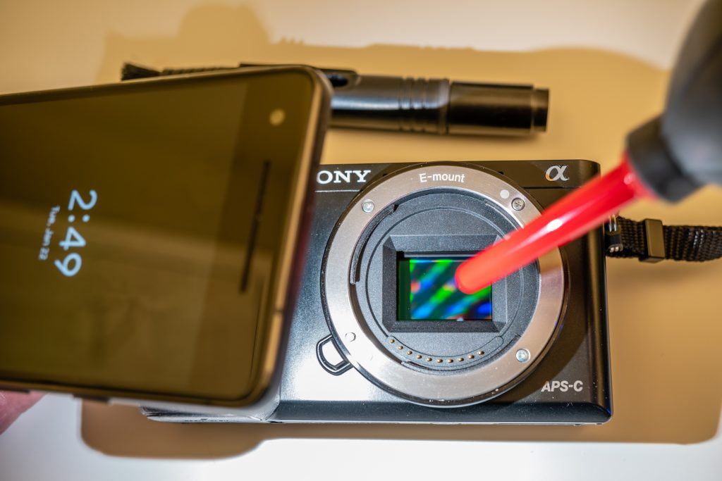 I like to use my phone flashlight to illuminate the sensor. I can lean it against the hand grip and it shows up any dust very well while leaving both hands free. Photo by Charles Haacker