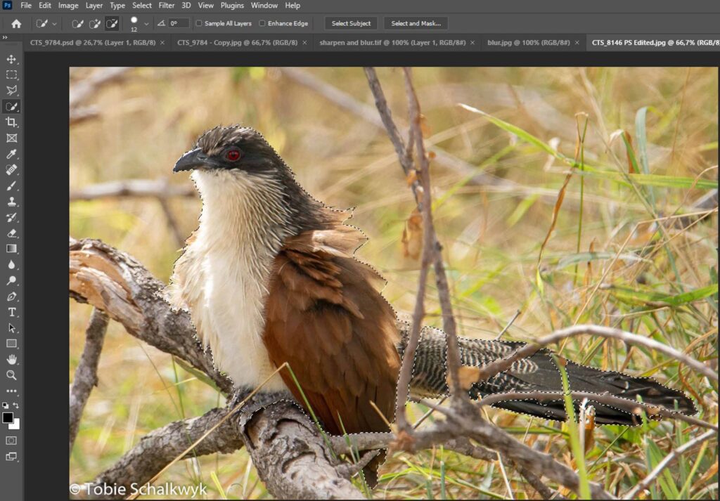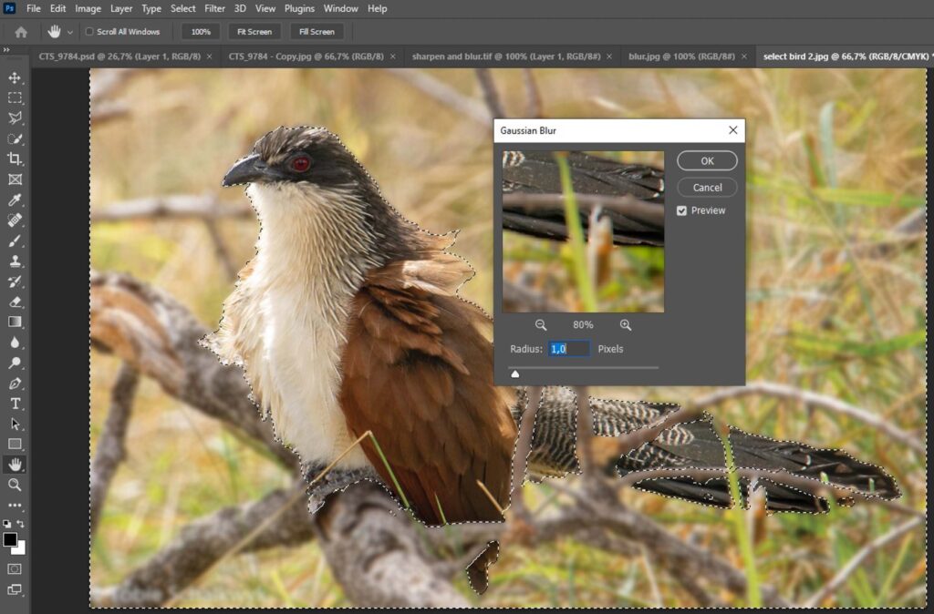 This can be done exactly by selecting the bird above. But sometimes there’s a better way, namely to select the area you do not want to be blurred (i.e. the bird above) and then inverse your selection by clicking Select/Inverse from the top menu (or use the Shift+Ctrl+I/Shift+Cmd+I shortcut).