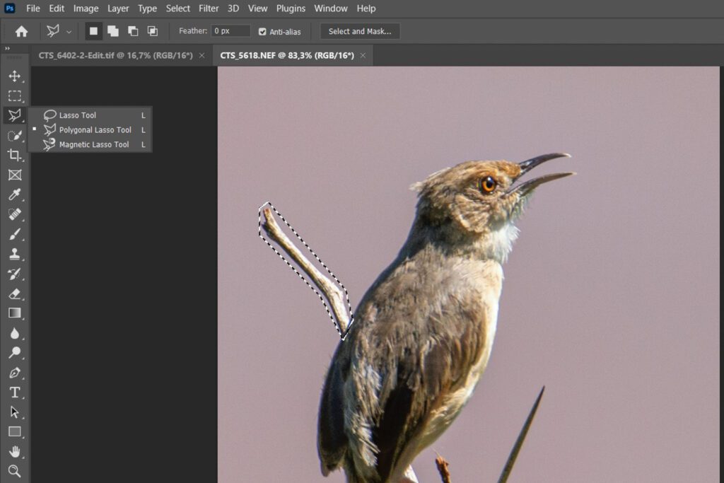 I’ve used the Polygonal Lasso Tool for selecting the branch, as I have found that Content-Aware Fill works best when I select an area just outside of the unwanted object. Also, I want the selection to just enter the bird’s body, so the Fill touches up the bird’s contour lines.