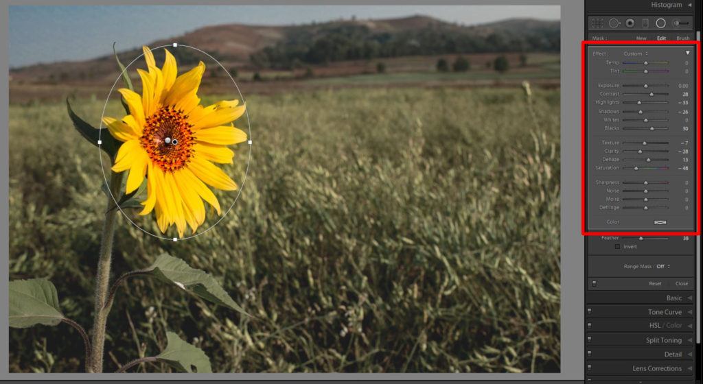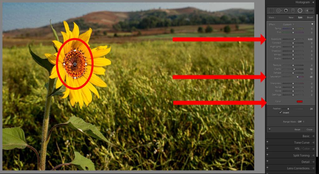 I first added a radial filter to the center of the flower. By default, the filter affects the area outside of the ellipse, so I checked the Invert box, which is located under the sliders. Now, when I use the sliders, the effect will take place within the ellipse.