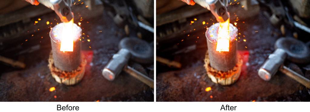 I added a circular-shaped radial filter to the main area of the top of the anvil and the blade the blacksmith was working on. At this stage, I inverted the filter. I then used the brush to extend the filtered area to include the part of the blade that was protruding.