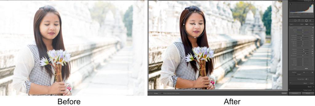 Using the radial gradient tool, I created a filter to cover the subject’s face in this photo. I then adjusted the sliders for the: