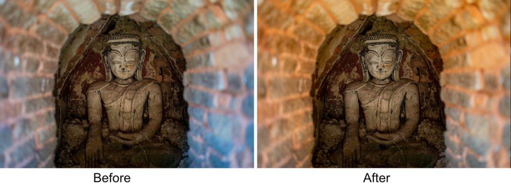 Even with a single light source, altering the white balance using a radial gradient tool can help. This white balance issue is the case with the photo of the Buddha image in the shrine. The only light source was the sun, but the light at the shrine’s entrance and at the back where the statue was was noticeably cooler.