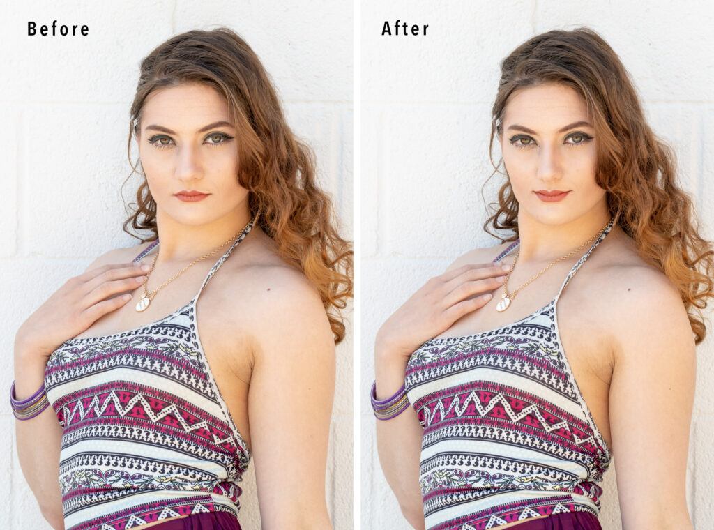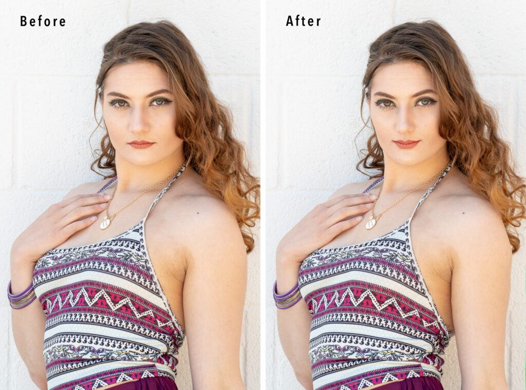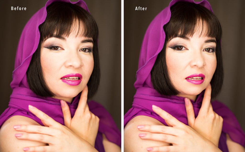 Before and after images showing facial features adjusted using the Face-Aware Liquify tool. Photograph by Jenn Mishra