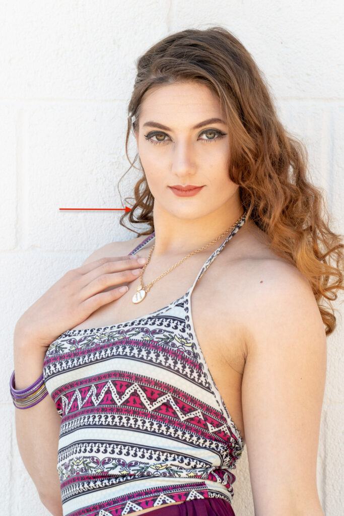 Portrait highlighting bulge in model’s neck. The Liquify Filter tool will help me fix this. Photograph by Jenn Mishra