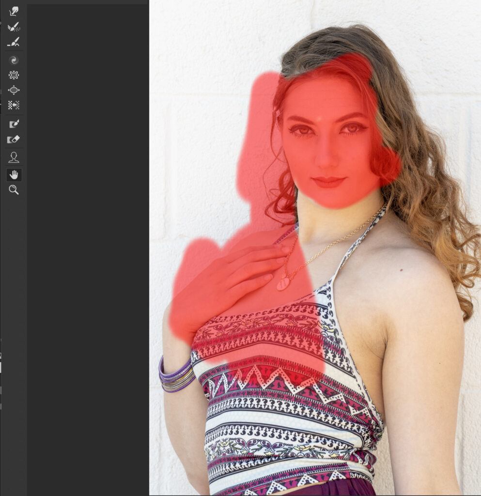 First, I’ll add a Freeze Mask to her face, hand, and hair to keep these elements from changing. The mask doesn’t need to cover the entire image, only the area where I’ll be working. Then, I’ll use the Forward Warp Tool to push the pixels of her neck into a straight line. I use small, gentle pushes rather than one big push to make the change look natural.
