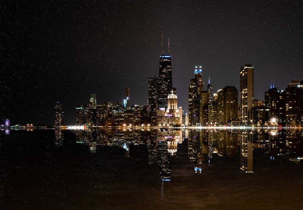Chicago skyline at night reflected in the lake. The reflection and stars are added to the original image. Photograph by Jenn Mishra