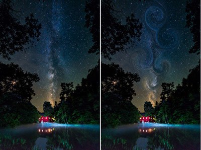 Original Milky Way image (left) and a “starry night” effect (right) created using the Twirl tool in the Liquify workspace. Photograph by Jenn Mishra
