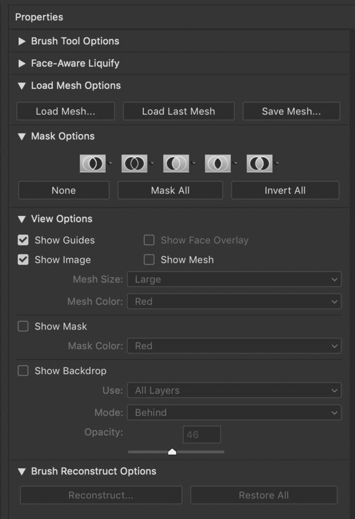 The Mask Options tab in Properties controls masks. The Freeze Mask and Thaw Mask tools allow you to select the parts of your image that will be affected by the Liquify tools. In the Mask Options tab, you can delete an entire mask by selecting None. If you want to mask all but a small area of the image, click Mask All and use the Thaw tool to unmask the area you want to change.