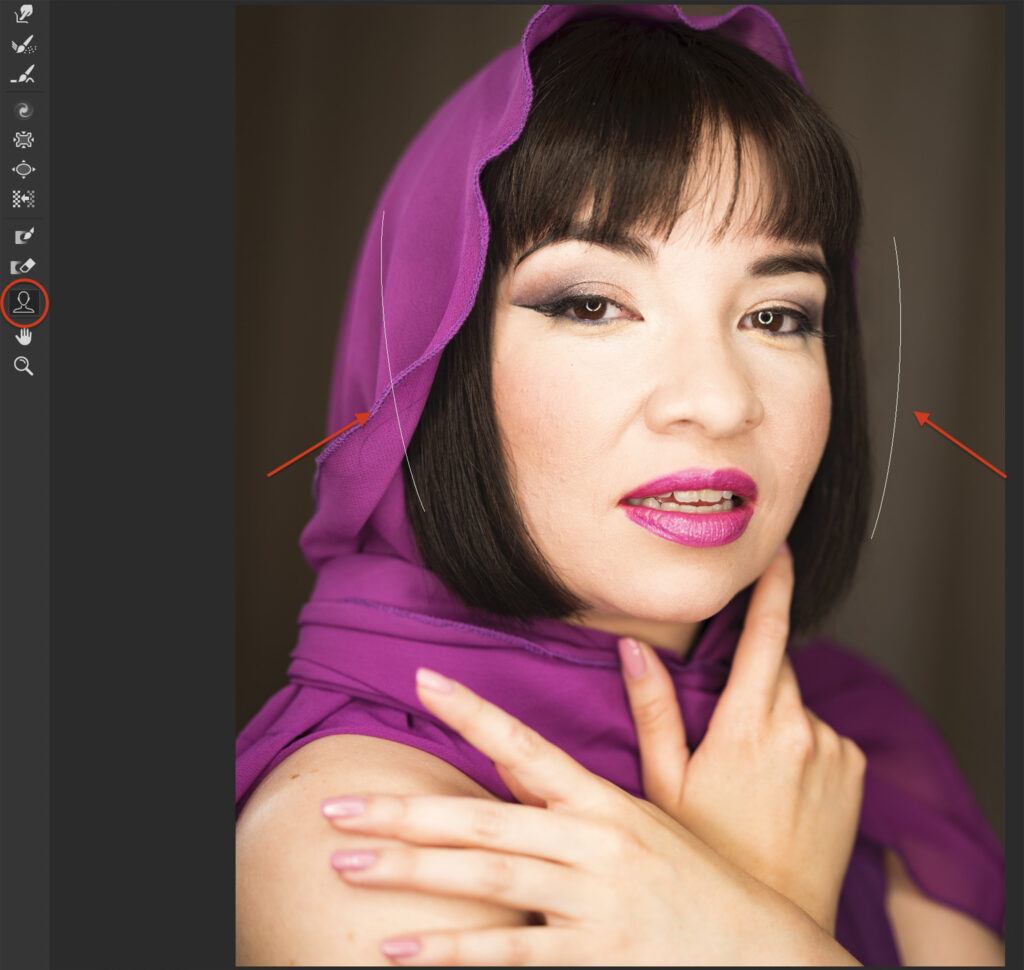 Face Select [A]. The tool looks like an outline of a person’s face and shoulders. This tool selects faces in your image. As you hover over facial features, warp tools appear allowing you to change the feature’s shape.