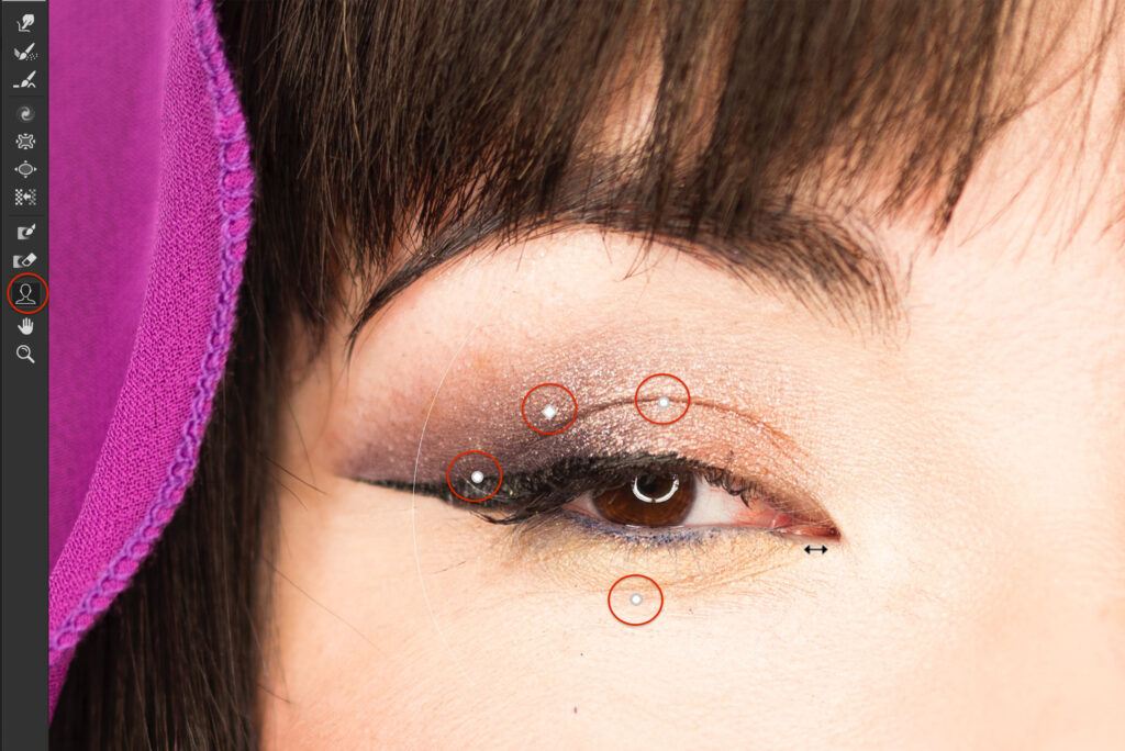When you hover your cursor over the facial features, additional options appear. You can change the features by grabbing one of the handles and dragging it. To show you how this works, I’m going to Zoom in on one of the model’s eyes using the Zoom tool and use the Move Image tool to center it.