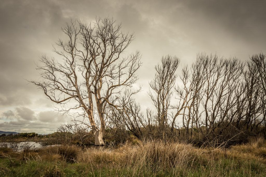 These trees are near a busy roundabout, but I could park on the roadside safely. My focus was set using the tall grasses after I figured out where my best position was with some trial and error shots. A timer delay allowed me to hide the remote and put my hand in position. Photograph by Stacey Hill