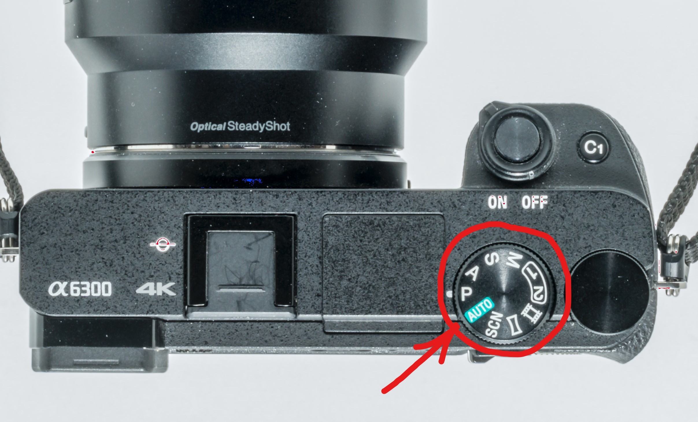 Every camera is different, but most will have some means of selecting one of the PASM settings. This is the selector wheel on my Sony A6300. Going clockwise from the green full-auto icon is Program, Aperture Priority, Shutter Priority, and Manual, then user presets #1 and #2. I ignore the rest as I shoot no video or scene modes because they output only JPEGs; I shoot nothing but RAW stills.