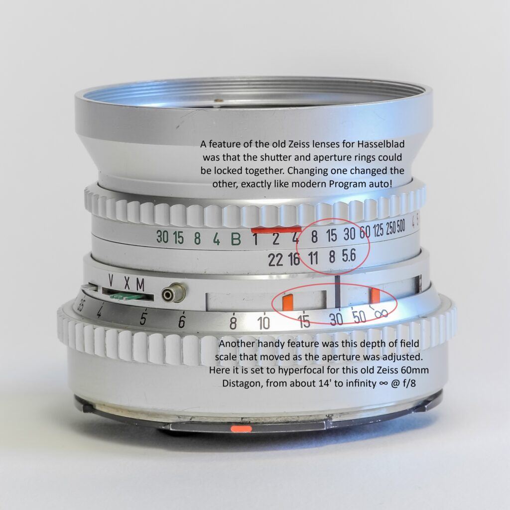 When I shot weddings back in the Lower Paleophotographic, I used Hasselblads equipped with Zeiss lenses like this one, a 60mm f/5.6 Carl Zeiss Distagon in Copal shutter. I show it because it had this clever feature where the shutter and aperture rings could be locked together. Changing one automatically changed the other, reciprocally, just like modern-day Program mode. Things don’t really change so much as they evolve.