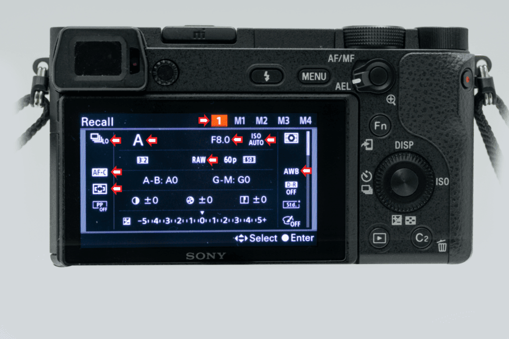 User Preset no. 1 on my Sony A6300. Starting at the top and working down, left to right.