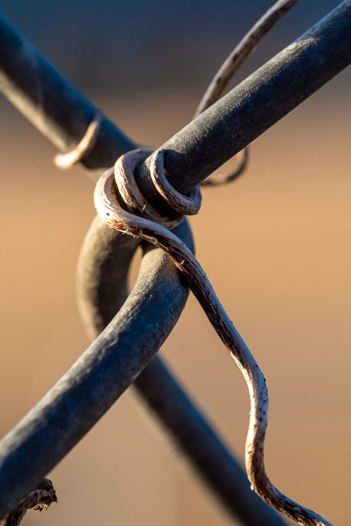 This image of a chain link fence and dried-out plant vine presents two subjects that are not conventionally beautiful. But when viewed up close, the vine and metal display some interesting shapes and details that would normally be overlooked. The contrast of the blue-tinged metal against the golden background creates added interest. Photograph by Leanne Cleaveley