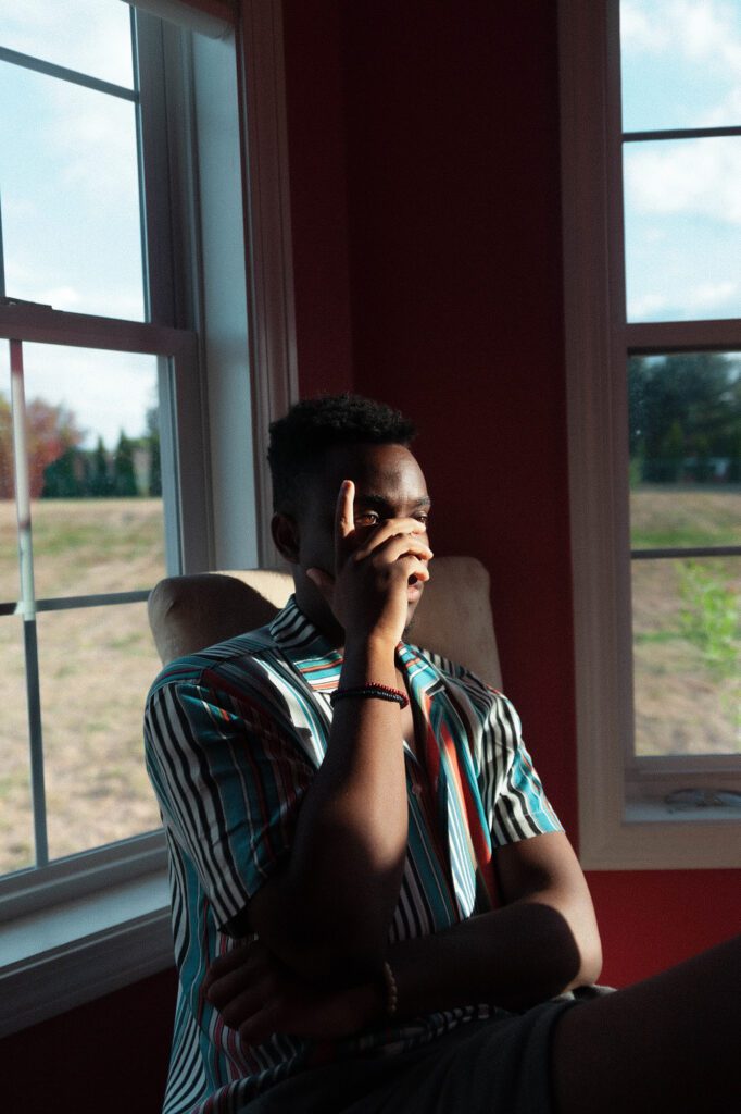 Positioning the subject close to these large windows allows light to fall on their face and arm, making for a striking composition. Photograph by Ari Williams