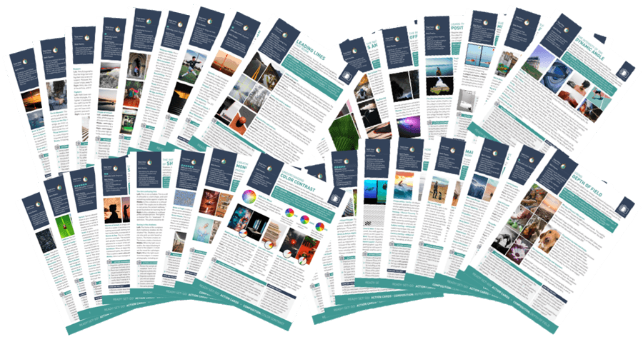 The Action Cards™ are conveniently organised and color-coded into 2 complete sets. They were specifically designed to work together as a whole. Each card, and each set within the group, were designed to help you strengthen and discover certain photographic skills.