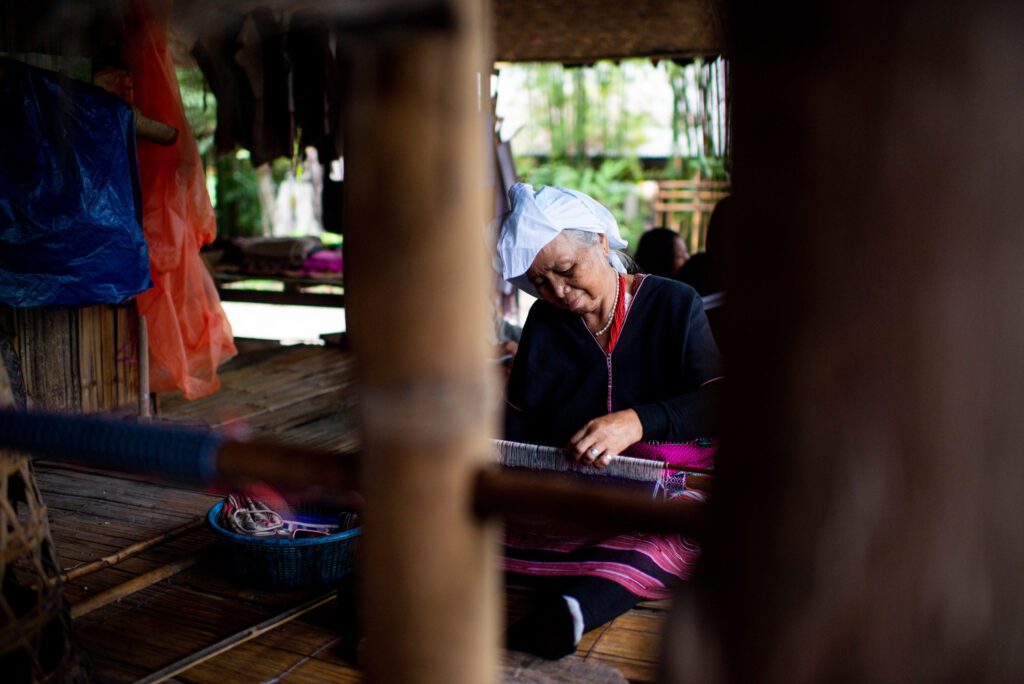In this image of a Hmong woman hanging her skeins of hemp thread out to dry, I have used her product to hide the background. Had I moved further back from her and included what was behind her, the story aspect of this photo would not have been so strong. It would have included some location context, but for this photo, I was interested in showing what she was doing rather than where she was.