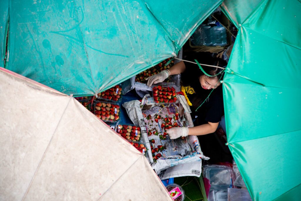 By looking through the large umbrellas at the woman packing strawberries, I was able to use them to block most of the clutter that surrounded her. If I’d been at ground level, I would not have been able to isolate her so well.