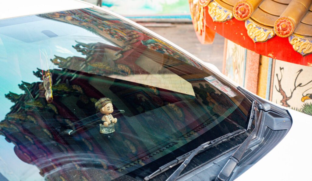 By photographing the dashboard ornament through this car windscreen, I’ve captured the structure of the temple reflected in the glass.
