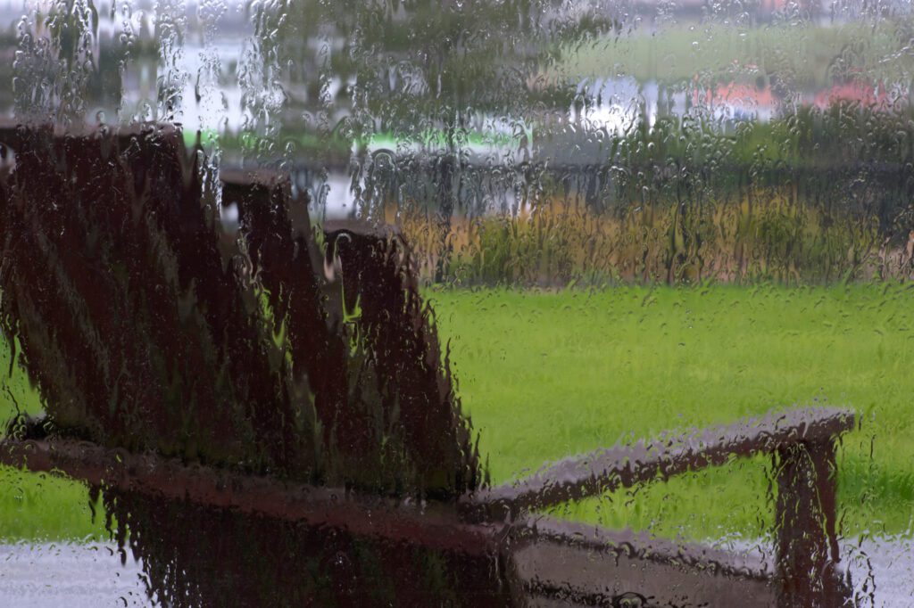 Flat window glass will not often distort what’s behind it unless it’s smeared with rain. For this composition, I took numerous photos as I experimented with focus and depth of field. This one I thought works best when I’ve focused on the glass and kept the chair just slightly out of focus. This shows the rain on the window and how it distorted the image of the chair most interestingly.