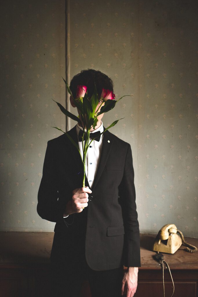 Surreal photography can be based on reality. In this image, the photograph is staged in a surrealistic style. The subject is made anonymous by the bouquet of flowers. Photography by Quinn Buffing