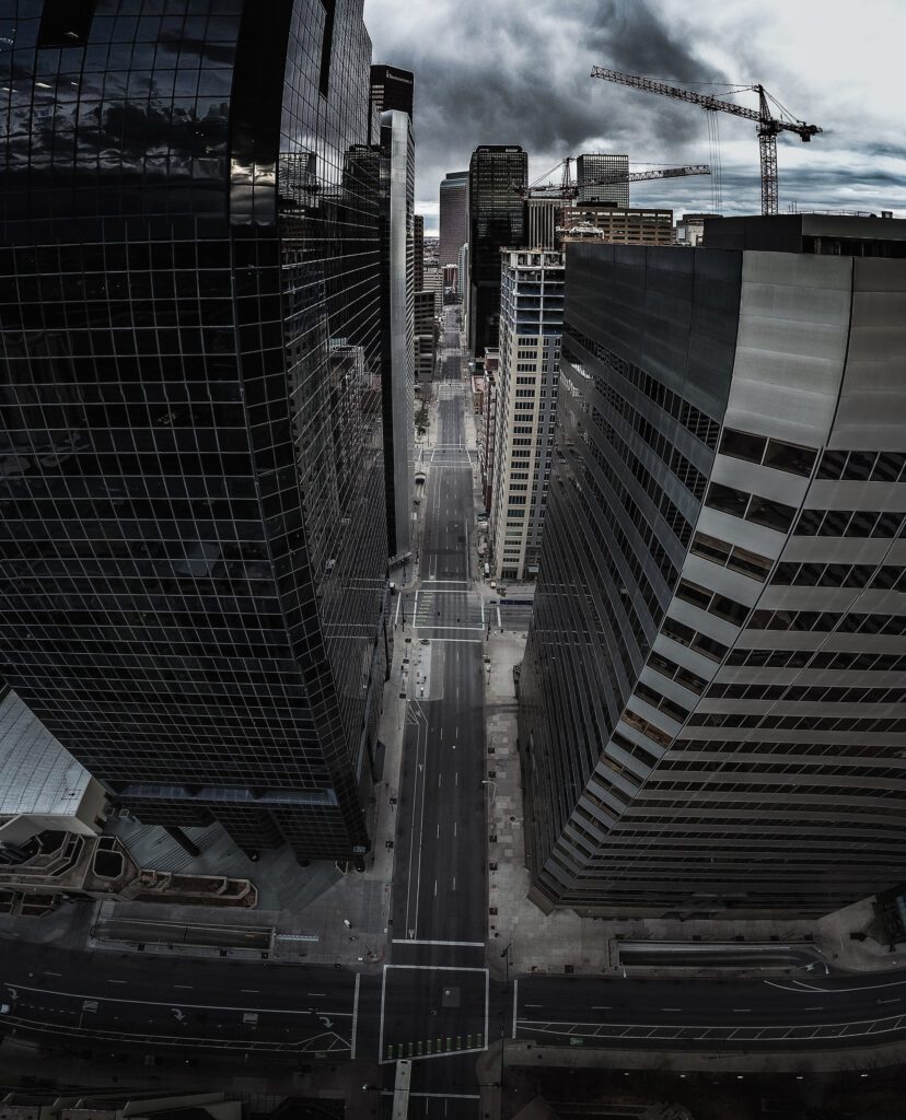 The street scene is real, but the high perspective and the lens distortion create a surreal effect. Photography by Henry Desro