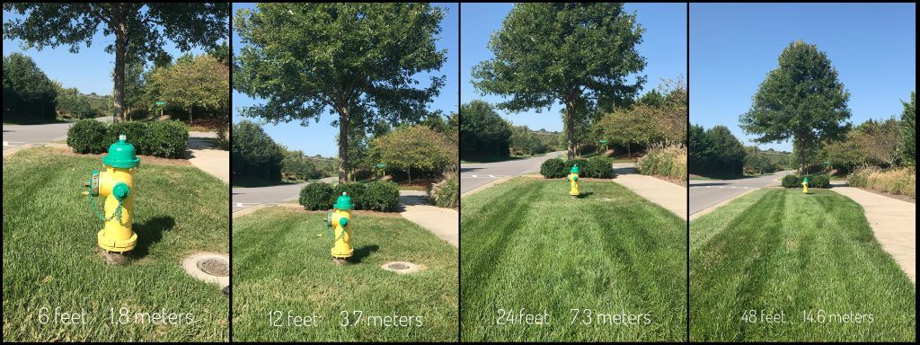 To become more familiar with distance and subject size, I used a fire hydrant as a test subject. (It was very cooperative and stayed in one place.) I took pictures from approximately 6’ (1.8 meters) to 48’ (14.6 meters) away from the hydrant.