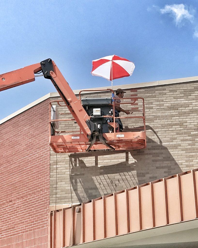The first picture taken in my new endeavor was in a grocery store parking lot. I like catching the quirkiness of life. This umbrella fixed to the top of a hydraulic lift drew my attention (photo above). Then, I noticed for the first time that when a brick building is being painted, it could be painted one brick at a time. Who knew?