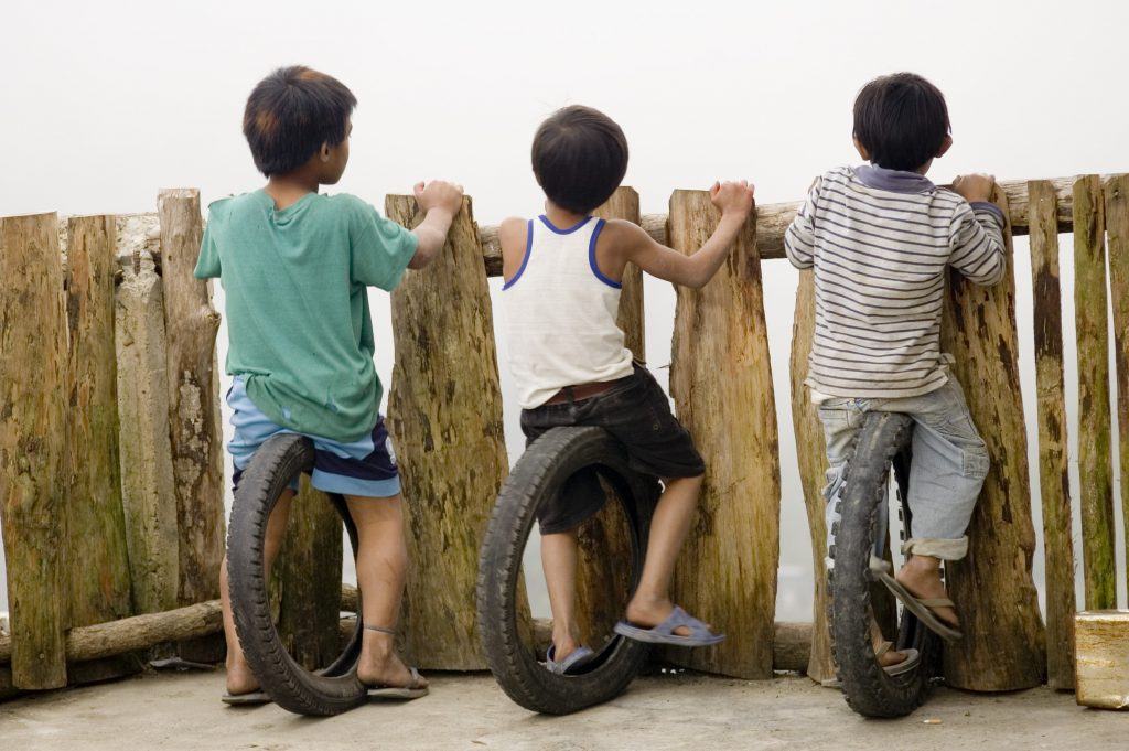 Three children sitting on tires looking over a wooden fence is a much interesting subject than just three children, or even three children simply looking over a fence. Photo by Karlo de Leon