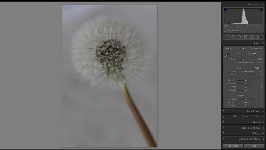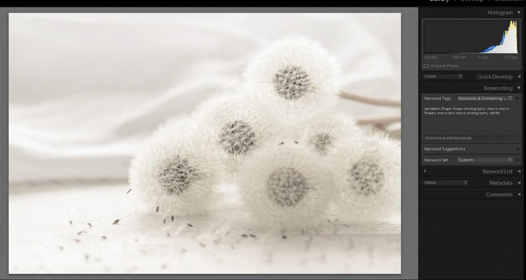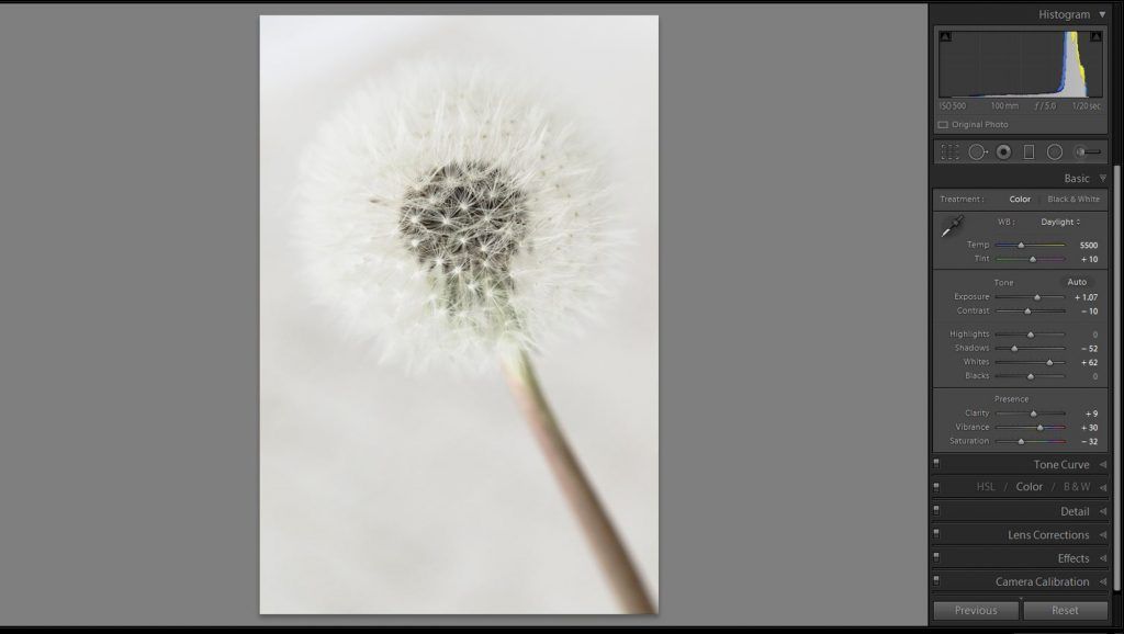 This dandelion image was shot with the window as the background (you can see the fabric of the translucent curtains). The dandelion is dark, because I have exposed for the background so that it’s not too blown out. I did not “shoot to the right,” and that was a purposeful decision. Shooting to the right would have rendered the background without any detail. In this case, it makes sense to create the high key effect primarily in post-processing, as I can then control where all of the tones will fall onto the histogram.