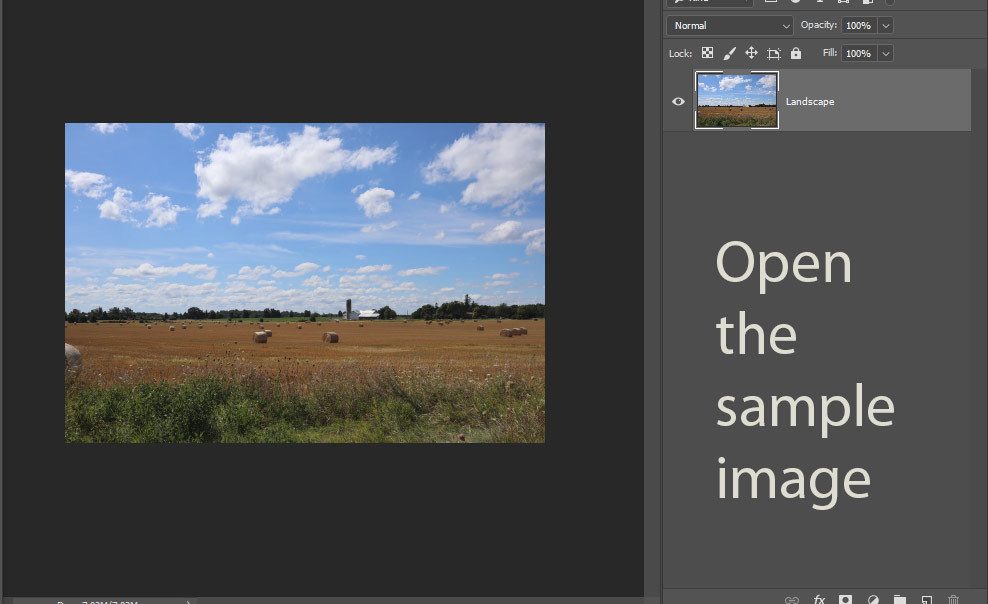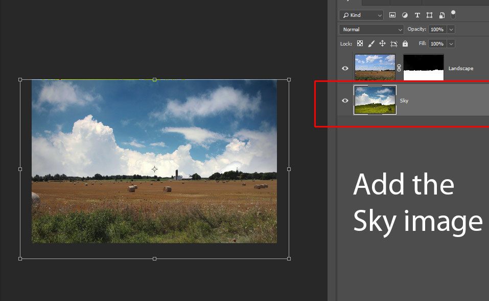 Download the sky image from Unsplash. Go to File > Place Embedded & place the sky image under the landscape layer. If you see a lock icon in your background layer you can double-click on the background layer to unlock it then you can place the sky image under it.