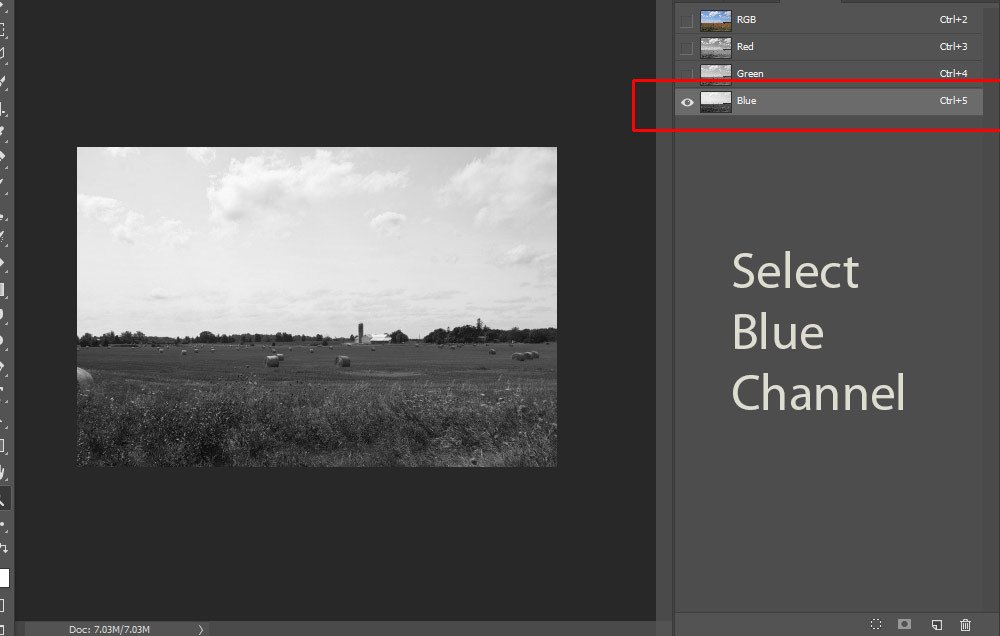 In my case, the blue channel is the channel which is providing a blown-out sky which is exactly what I want. Now select the blue channel as you can see I have selected it.