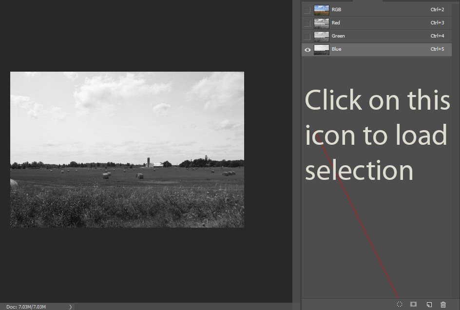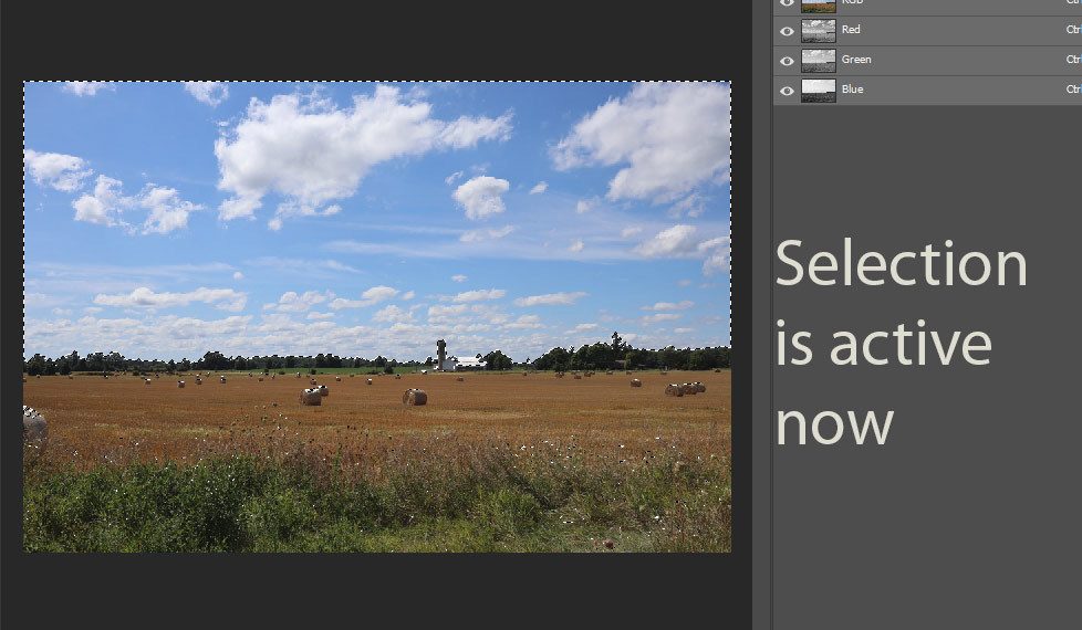 Once you click on the Load Channel as Selection icon you can see the selection is active and we have selected the sky in just one click. Don’t forget to click on the RGB Channel to switch back from Blue to RGB channel.
