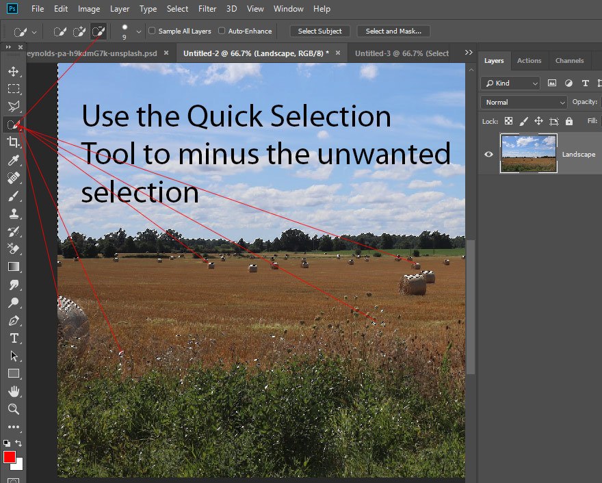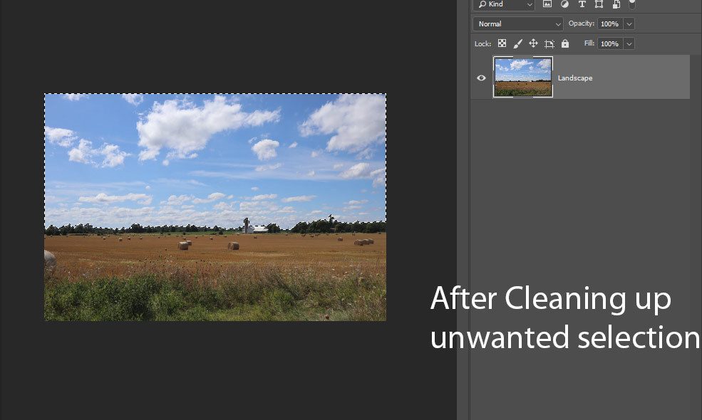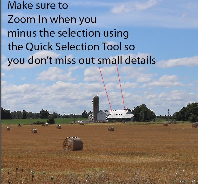 With Blue channel, we have also selected those parts that are blown-out or almost white & these parts include some parts of our background such as hay bales, there are many parts if you zoom in. To get rid of this selection, we have to minus it manually and we can do this using the Quick Selection Tools (W).