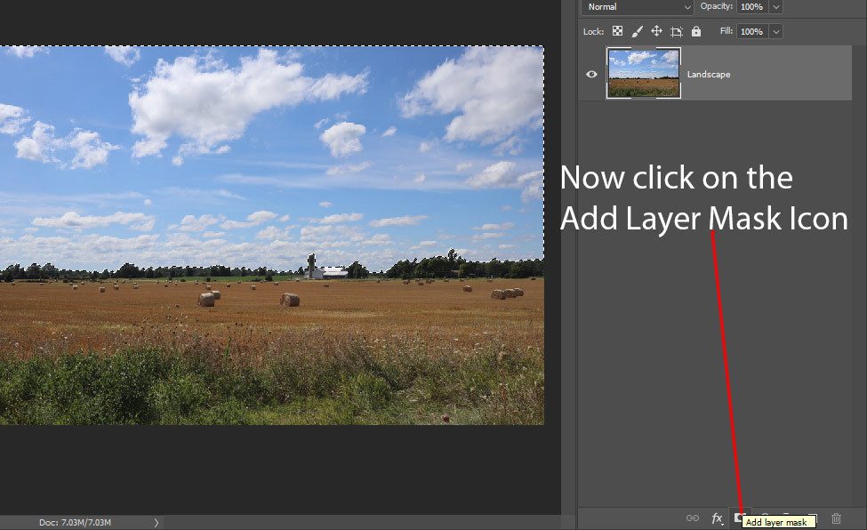 To isolate the sky we need to add a layer mask. To do this, click on the Add a Layer Mask Icon at the bottom of the layer panel. You can also go to Layer > Layer Mask > Reveal All to add a layer mask.