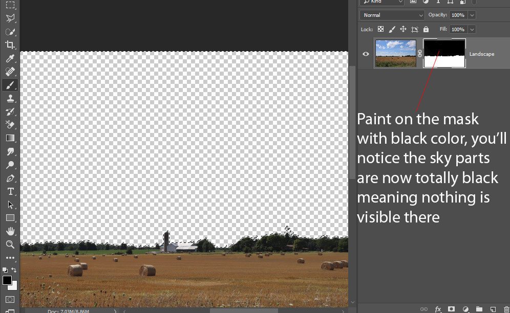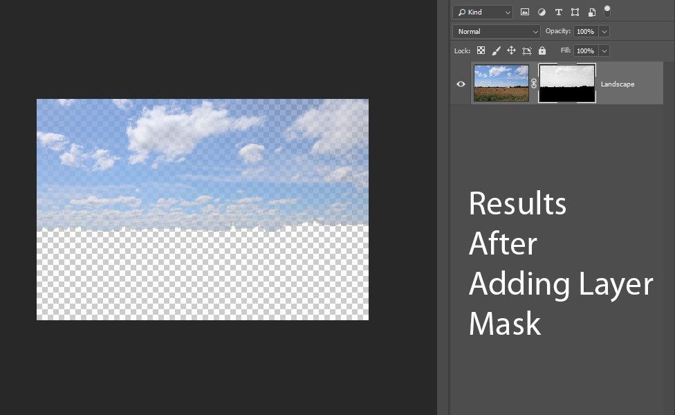 With these results, if you add a new image below the landscape image these parts can overlap each other. While these parts can help you if you are creating compositions because these parts may match with your new sky. But for the sake of simplicity, we’ll remove the sky completely that means we need to turn the layer mask totally black.