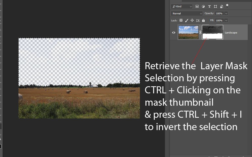 Hold down CTRL & click on the mask thumbnail to retrieve the selection & then press CTRL + SHIFT + I invert the selection so we can select the sky.