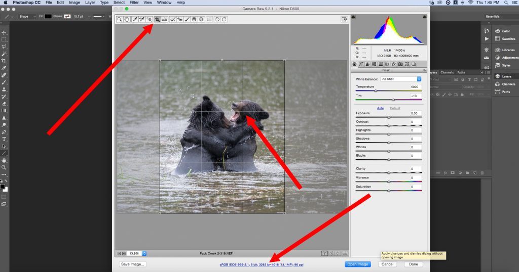 - Will you have enough resolution left to use the photograph, as you would like to? The bottom red arrow shows you where this information is located. In this case, Mark’s original file was quite large. Even with the vertical crop from the horizontal frame there is enough resolution to print this cropped file into a very large wall print for display.