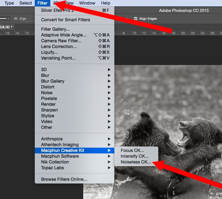 All photographers have different workflow suggestions. I like to do noise reduction early in the process. Noise reduction, by the very nature of how it works, reduces clarity and sharpness in an image. By employing my noise reduction early, I can then go back and tighten up the clarity and sharpness in areas that I think are important. You’ll see this in a minute. Again, there are many programs and ways to reduce noise. I’m just going to cover my method. I’m going to my Filter menu and selecting the Noiseless CK Noise Reduction Program.