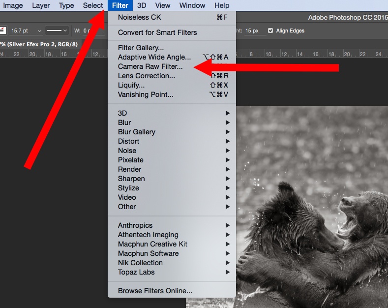 Open the Filter drop-down menu and select “Camera Raw Filter.”